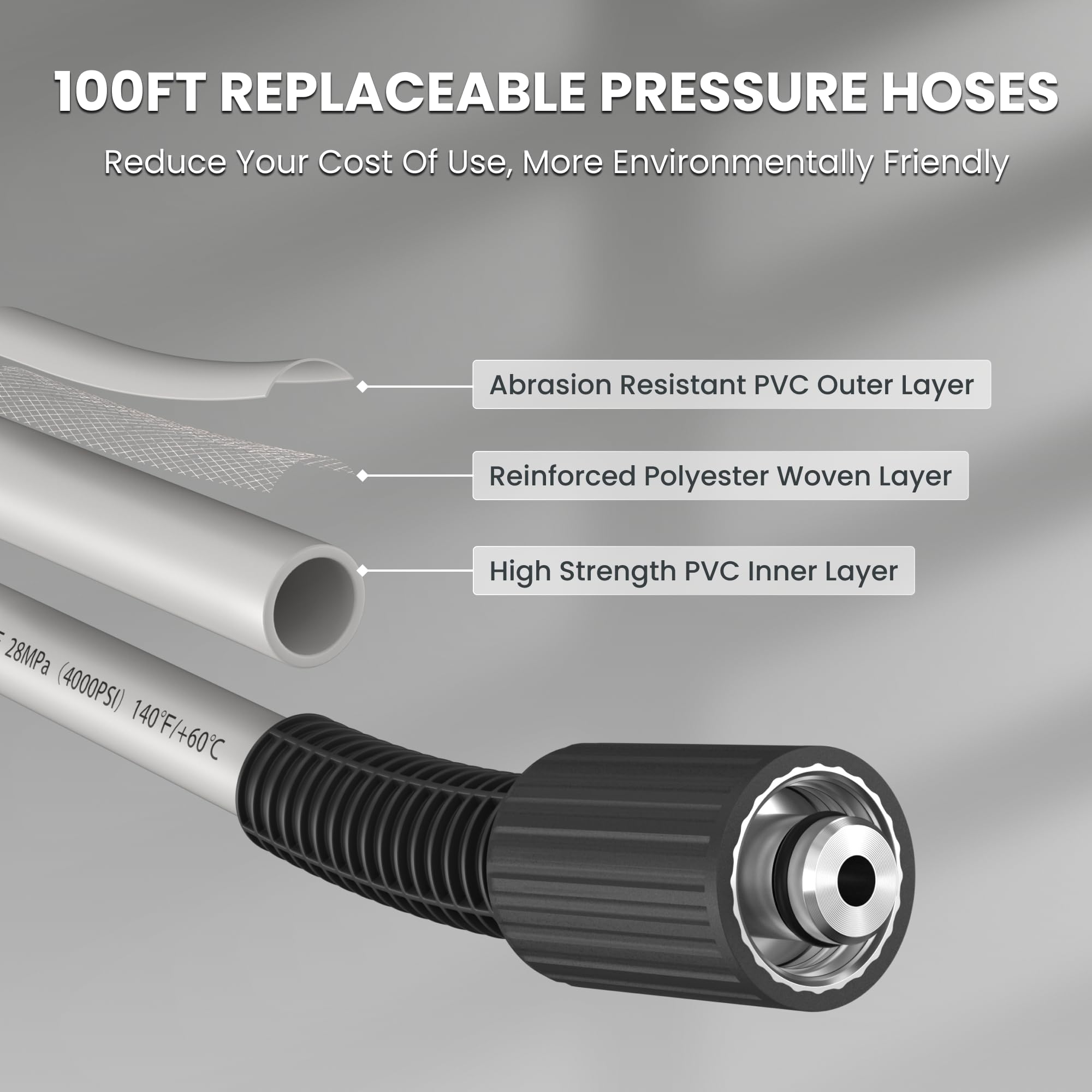 - 100 FT Replaceable Pressure Hose: Giraffe Tools Pressure Washer featuring a 100 ft replaceable hose(32 °F-104 °F). Constructed with three-layer composite anti-explosion material, it’s designed to tackle even the toughest cleaning jobs. The detachable hose is for easy recycling and reuse, reducing the amount of product waste