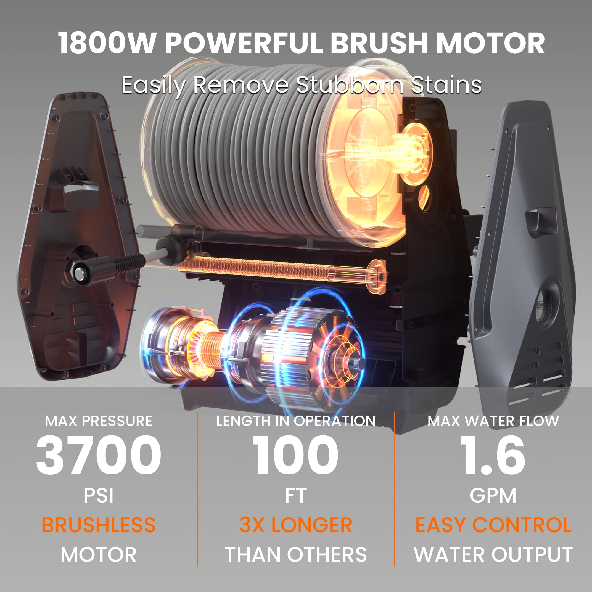 - Powerful 1800 Watt Induction Motor: Generates up to 3700 psi of water pressure and 1.6 gpm of water flow for handling even the most stubborn grime quickly and effortlessly. Tackling tough tasks such as tar, grease, oil stains, rust, and stubborn grime is effortlessly accomplished